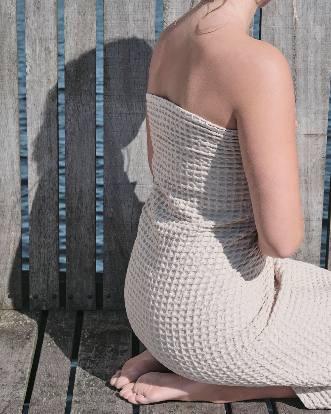 Stort härligt badlakan i tjock våfflad bomull. Kan även användas till yoga på stranden eller bara svepa om sig när det är lite kyligt.