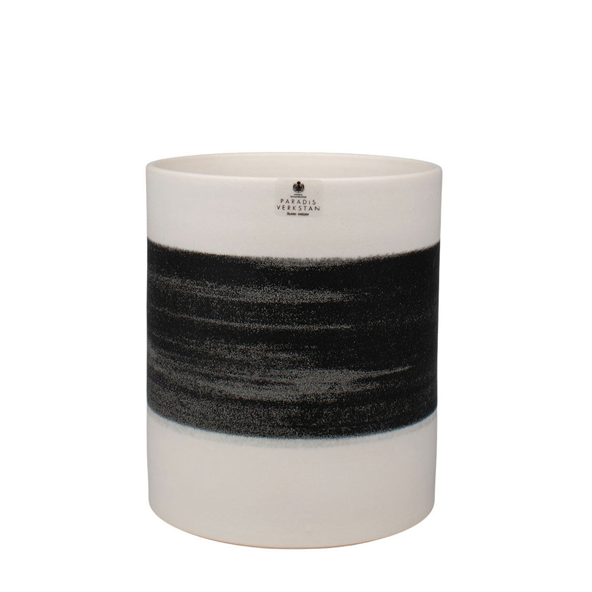 Handdrejad vas i vit porslinslera i vit glasyr med brushad svart horisont.