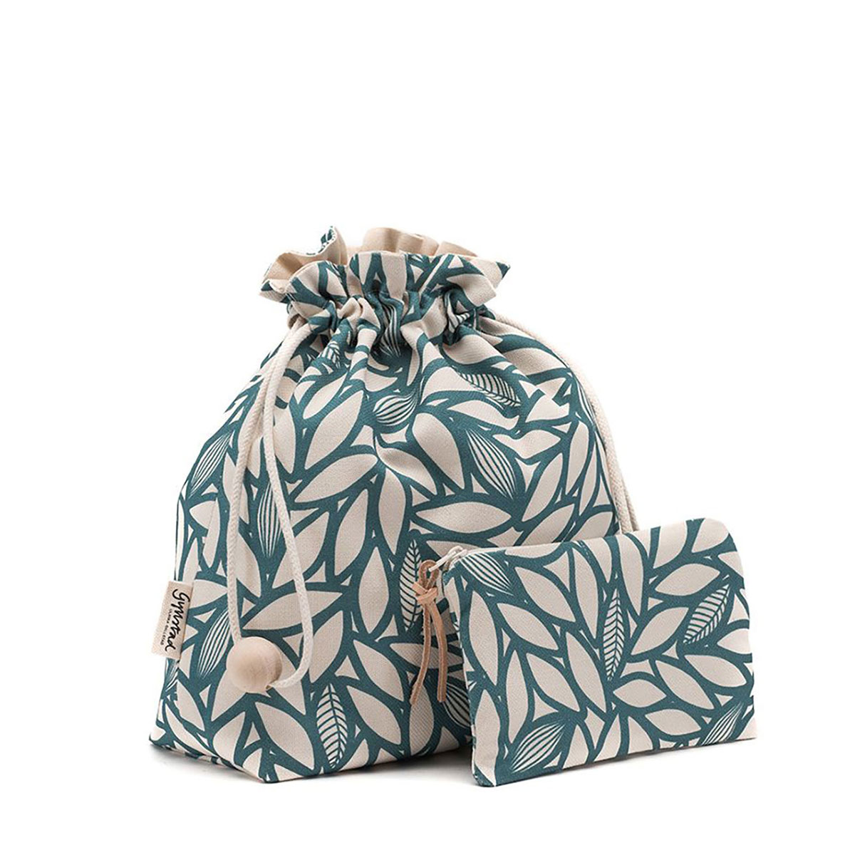 Drawstring necessär som är bra till förvaring av saker i ditt badrum eller i hallen. Kan både stå eller hänga. Påsen är också perfekta till förvaring av ditt handarbete. Necessär med drawstring och träkulor som handtag. Fodrad med stadigt foder.