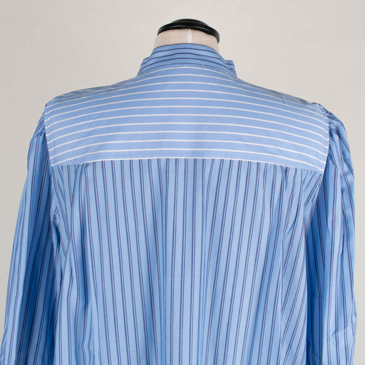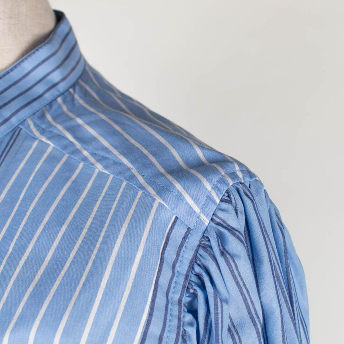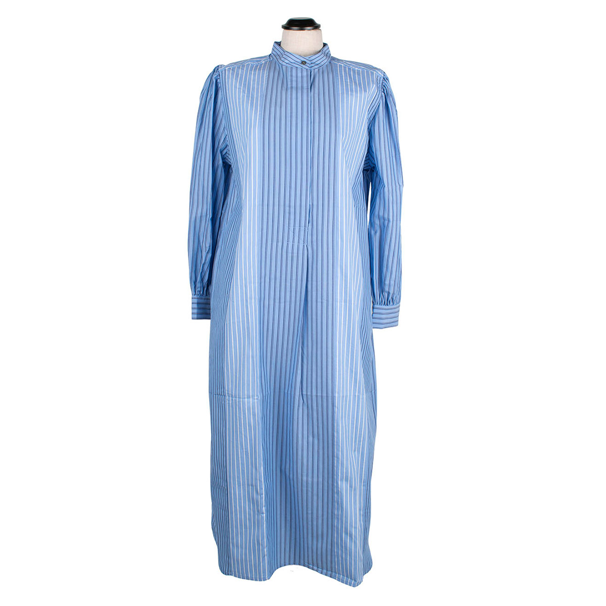 Egona är en klassisk skjortklänning med kinakrage. Oxfordränder i patchwork. Infälld knäppning framtill som avslutas i en hel klänning nedtill. Infällda fickor i sidorna.