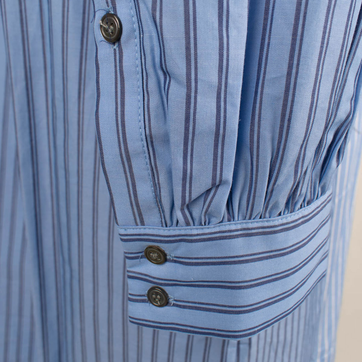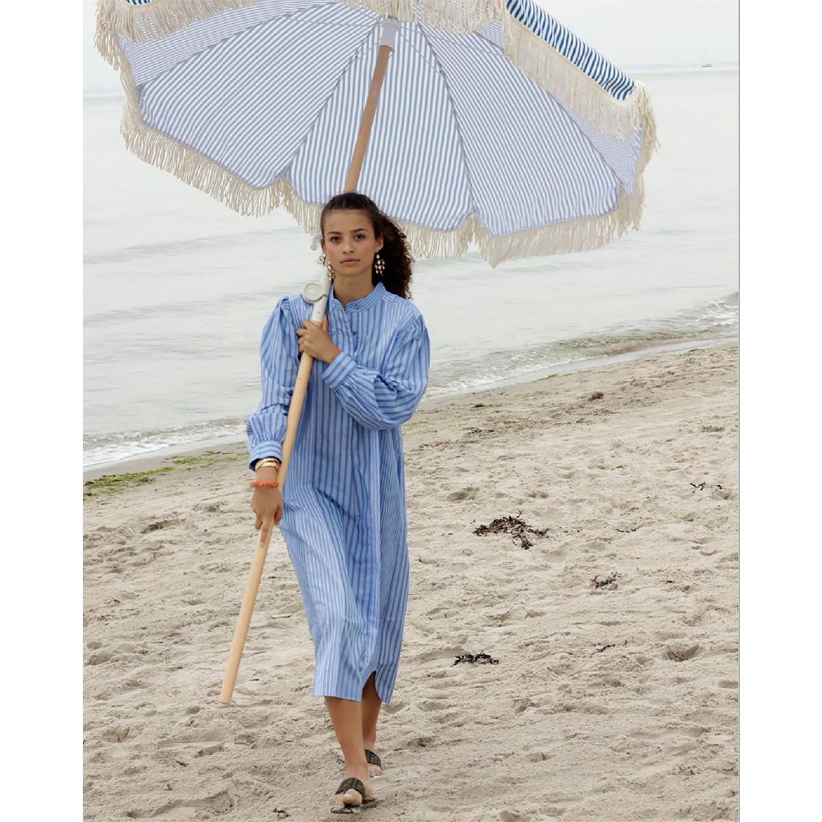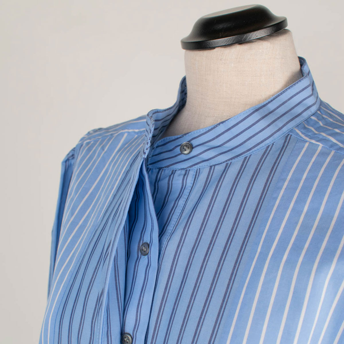 Egona är en klassisk skjortklänning med kinakrage. Oxfordränder i patchwork. Infälld knäppning framtill som avslutas i en hel klänning nedtill. Infällda fickor i sidorna.