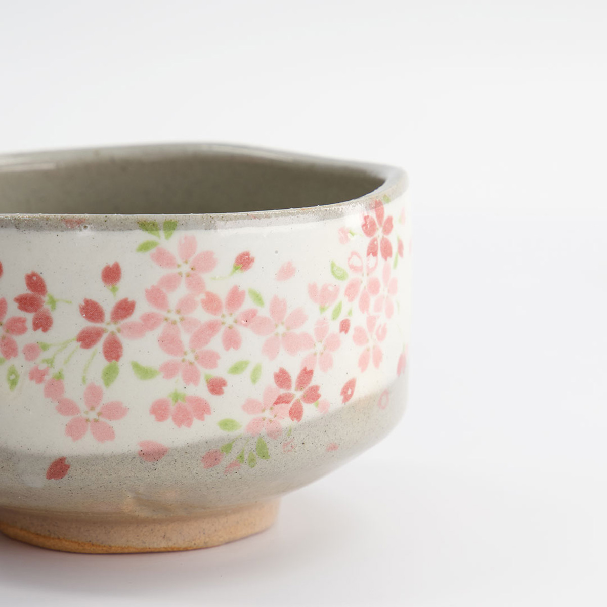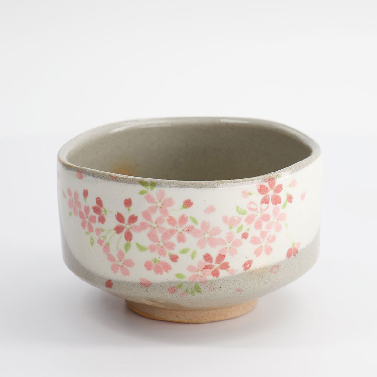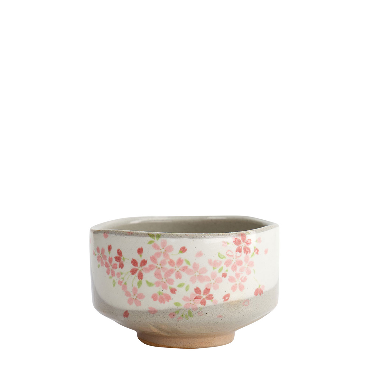 Denna vackra japanska matcha-skål i keramik pryds av ett mönster med körsbärsblommor, vilket gör den extra passande på våren.