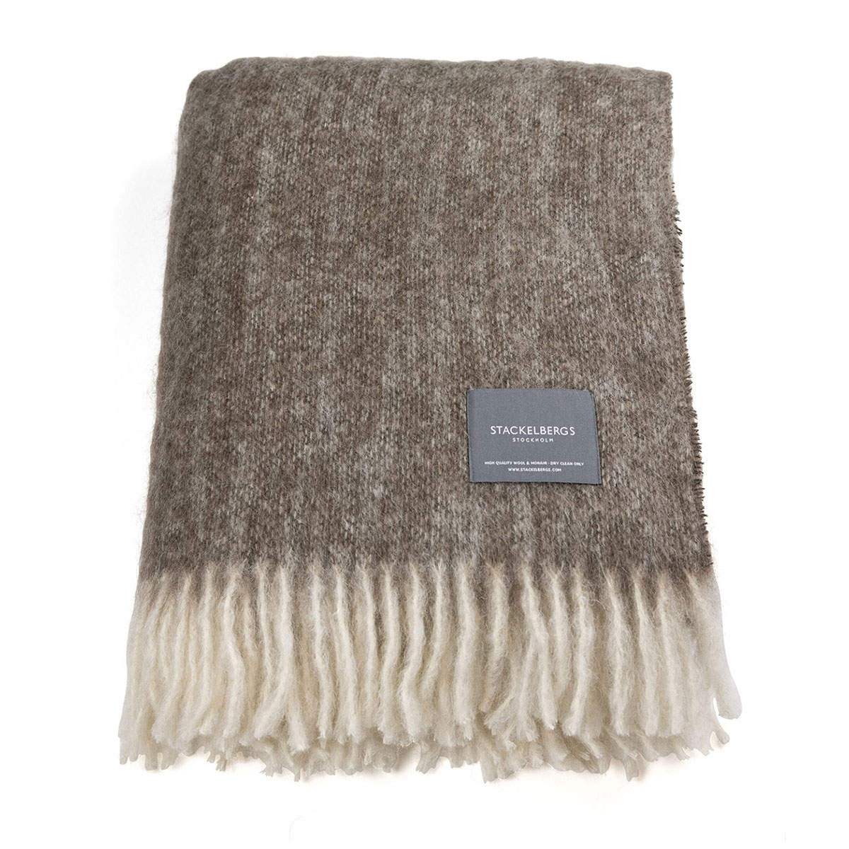 Rullad frans är kännetecken för Stackelbergs mohairplädar i hög kvalité.