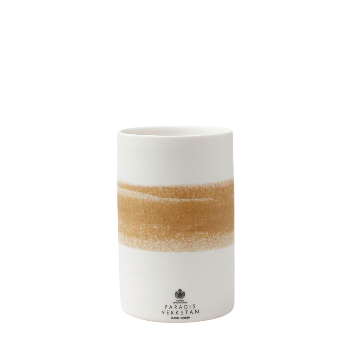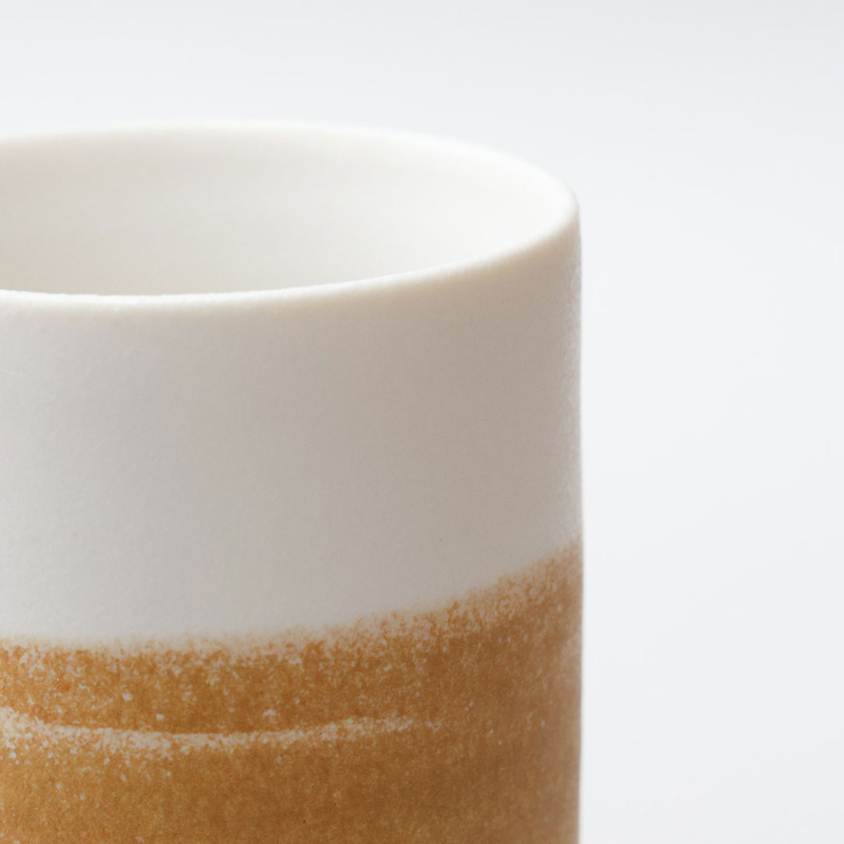 Mugg ingår i ”Skymning till Mork”, en grafisk kollektion i vit porslinslera med färgade silhuetter. Den vita porslinsleran är målad i olika grader av ockra i grafiska mönster. Inspirerad av origami och tuschteckningar.