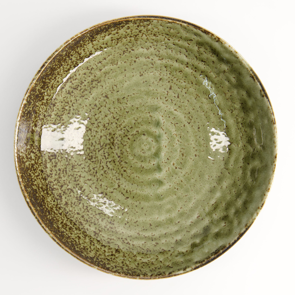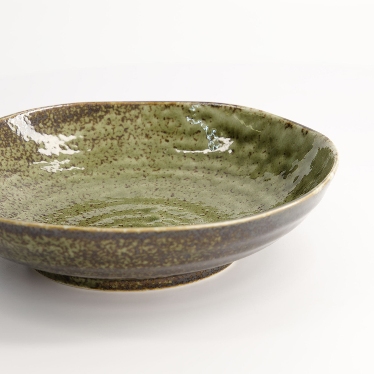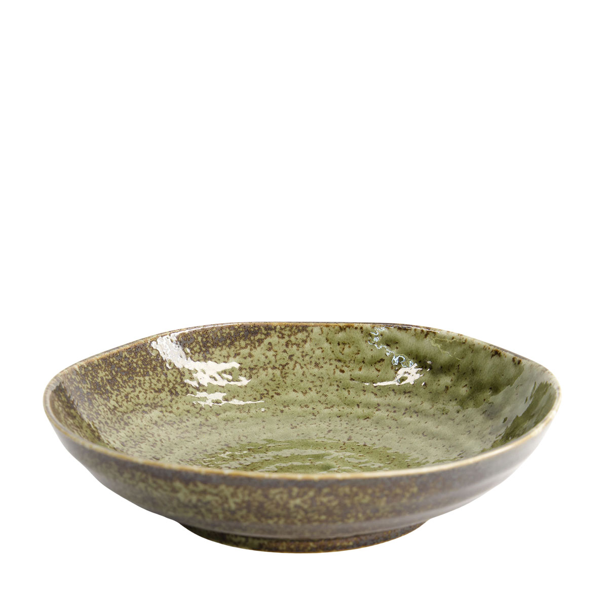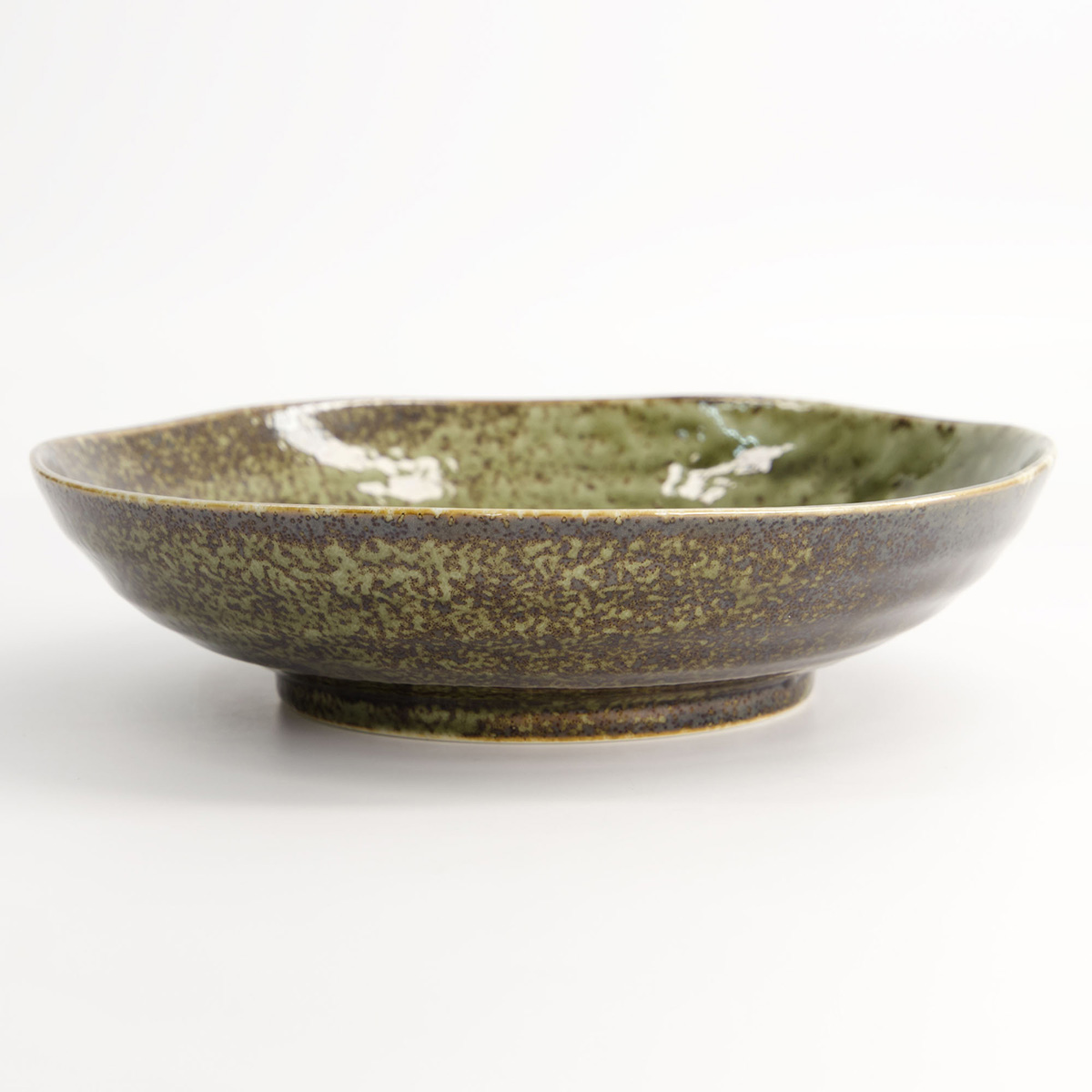 En något djupare tallrik som passar till att servera pasta på. Organisk form i högblank glasyr i grönt med inslag av brunt.