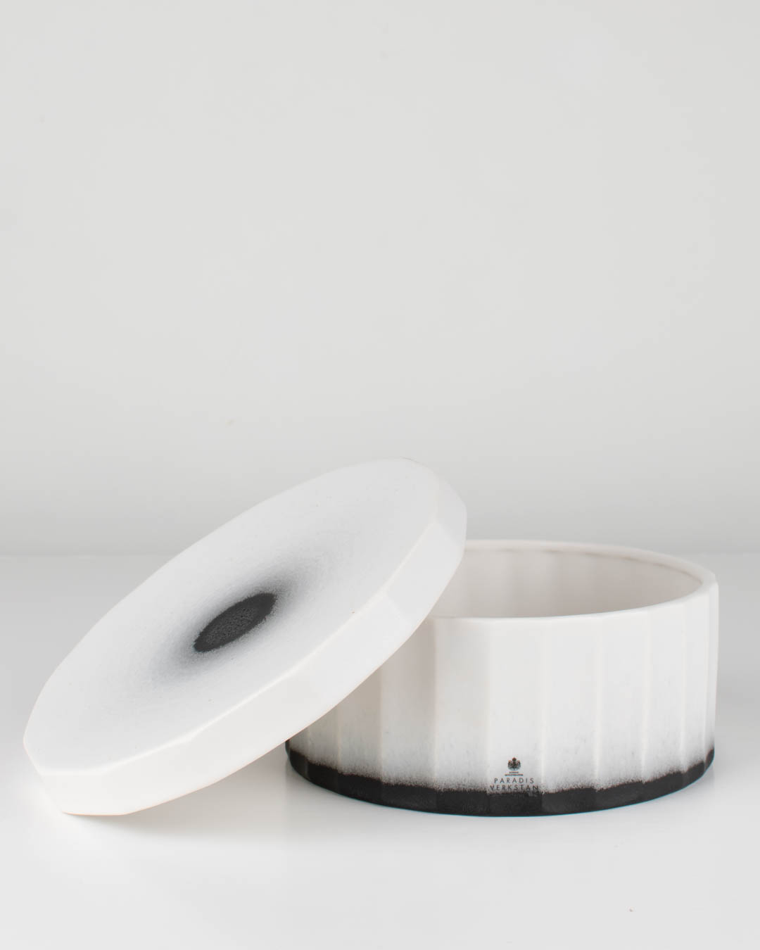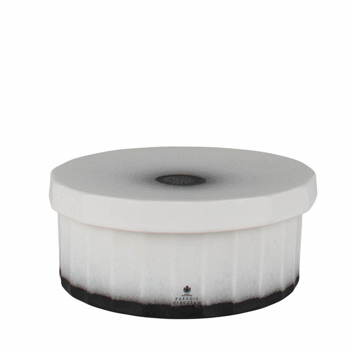 Skål med lock ingår i ”Skymning till Mork”, en grafisk kollektion i vit porslinslera med svarta silhuetter. Den vita porslinsleran är målad i olika grader av svärta i grafiska mönster. Inspirerad av origami och tuschteckningar.