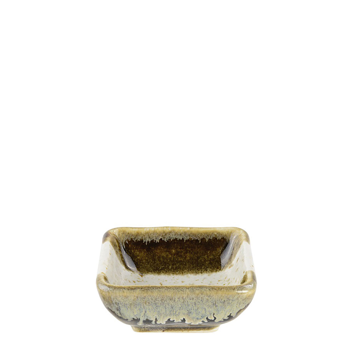 En liten vacker skål som passar utmärkt till att servera soja ur till sushin. Grå och brun glasyr.