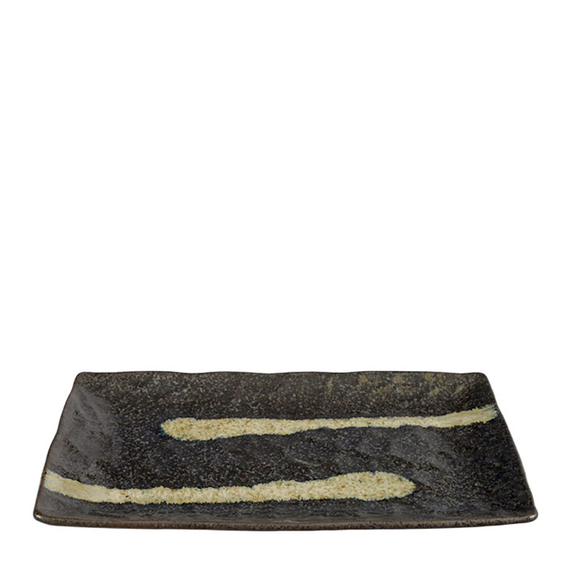 Stor tallrik i svartbrunt som passar bra till både sushi, tappas och att servera tillbehör på vid en brunch. Tallrikens yta är ojämn.