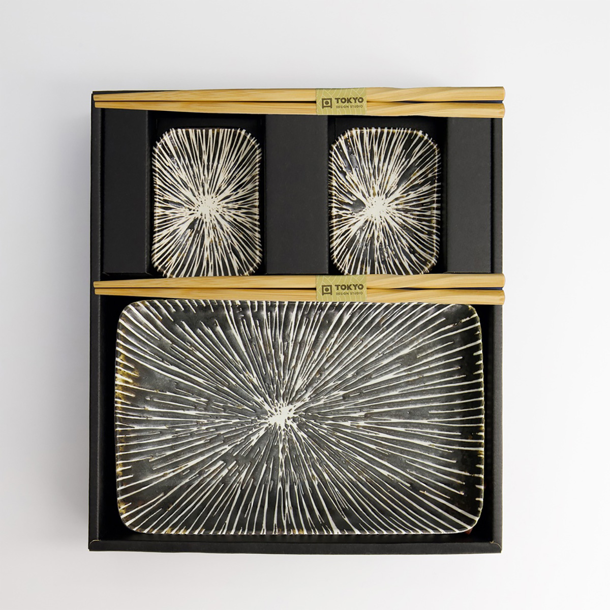 Presentkartongen innehåller 6 delar – 2 sushitallrikar, 2 sojaskålar och 2 par ätpinnar.