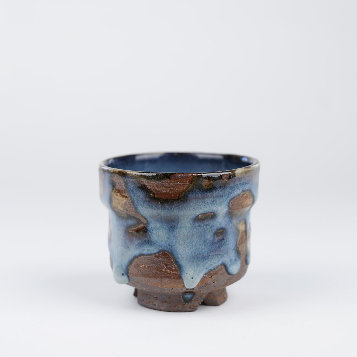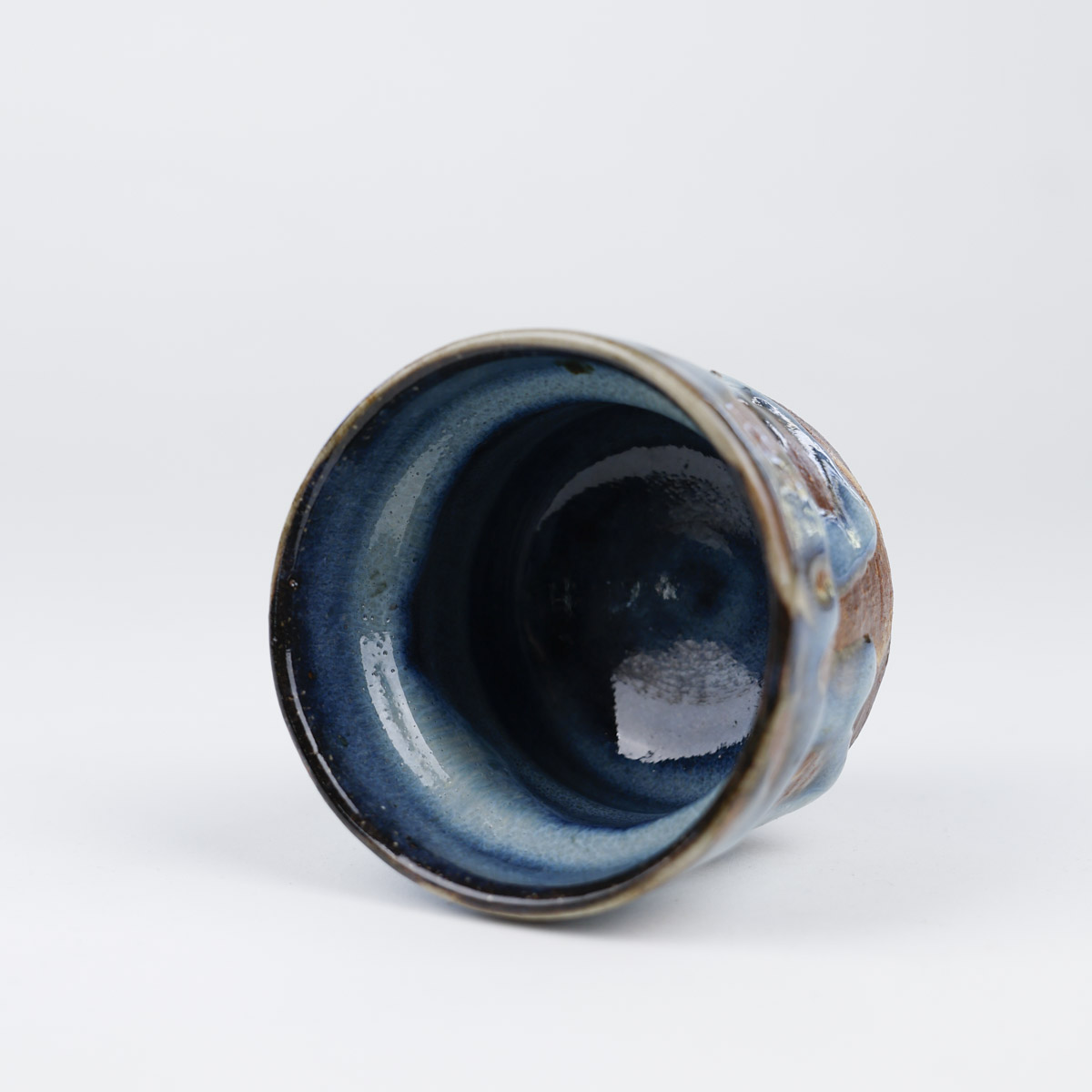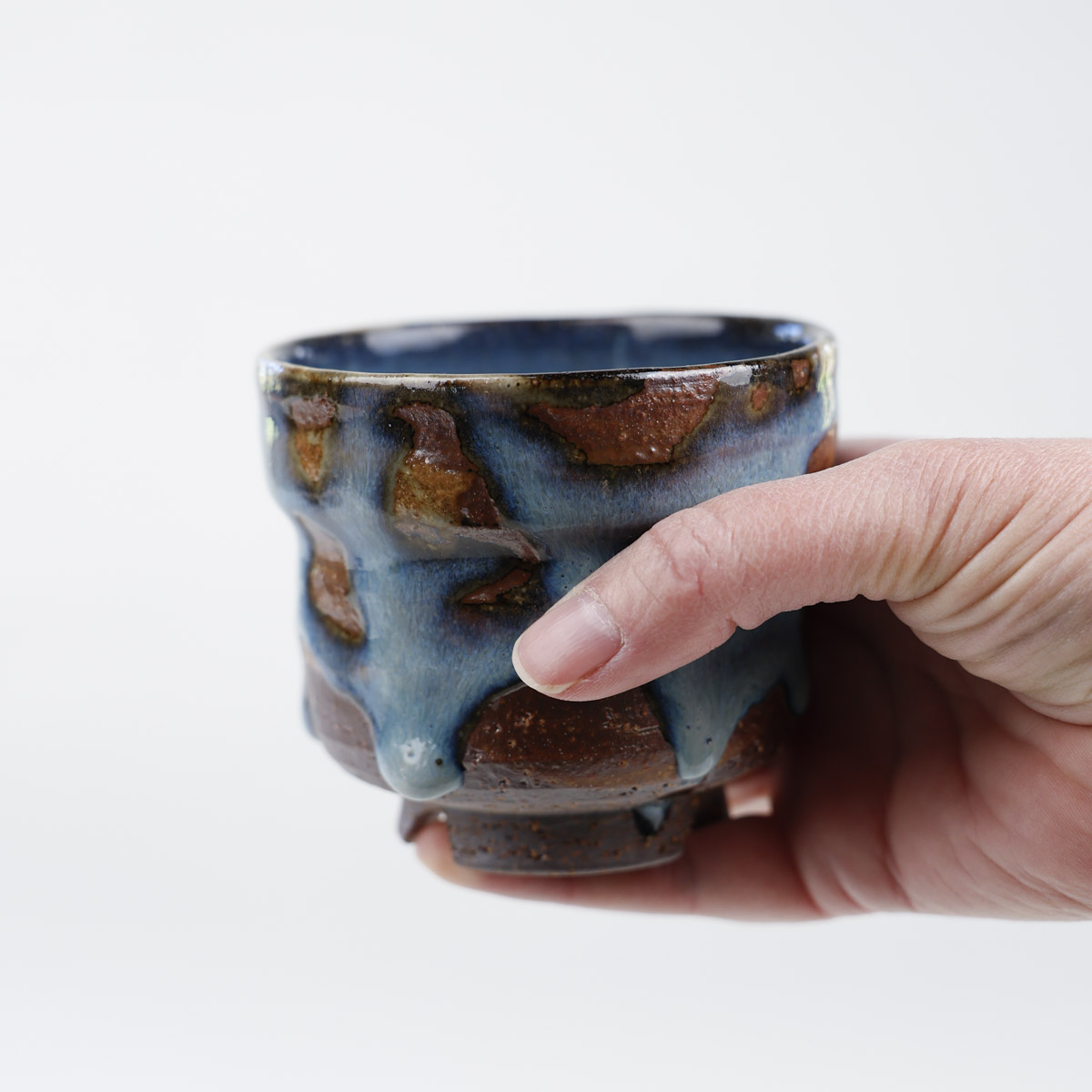 Japansk handgjord tekopp med en vacker blå glasyr på en brun lera. Av japanska keramikern Seigan Yamane.