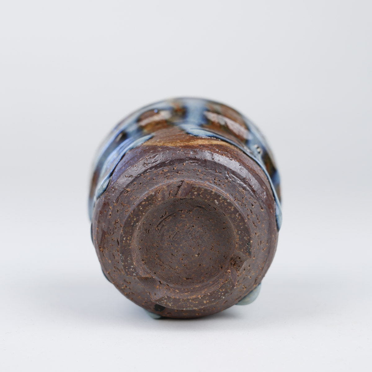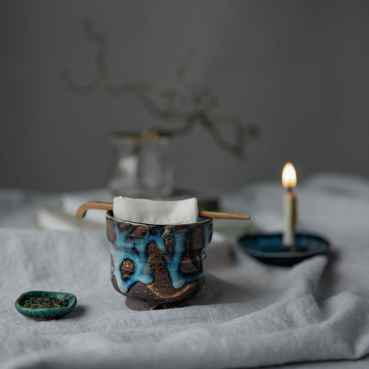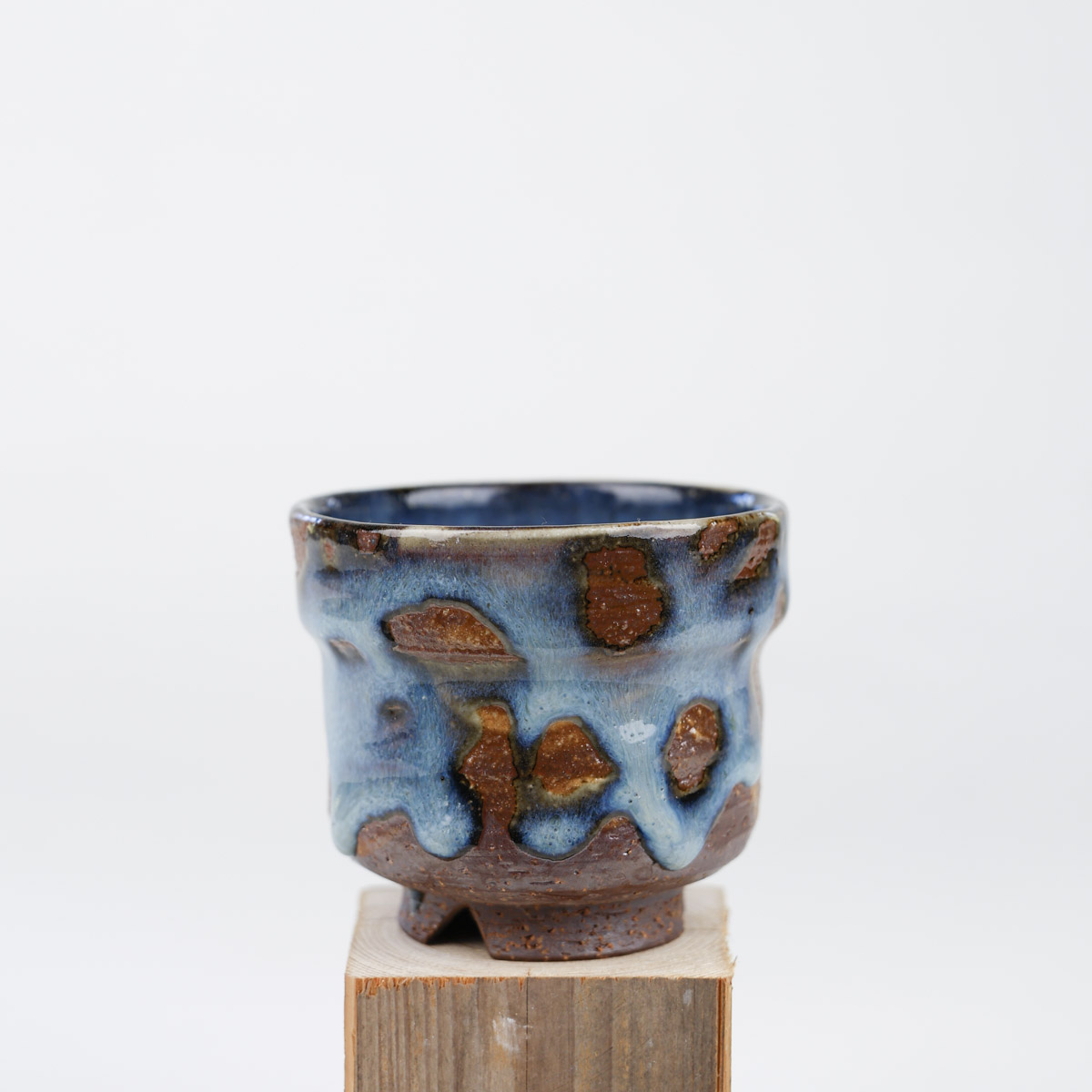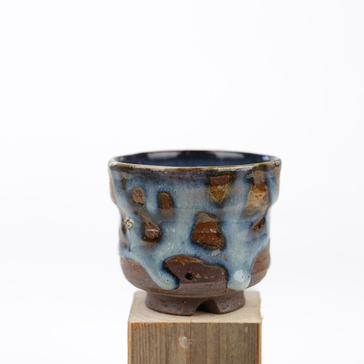 Japansk handgjord tekopp med en vacker blå glasyr på en brun lera. Av japanska keramikern Seigan Yamane.